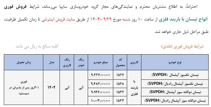 به گزارش آی آر آر اس اس؛ شرکت زامیاد زیر مجموعه سایپا شرایط فروش وانت کار و تجاری خود را با چهار کاربری ویژه آذر ۱۴۰۴ اعلام کرد. در شرایط فروش زامیاد نیسان تک سوز آپشنال، نیسان تک سوز آپشنال رادیال، نیسان دوگانه سوز آپشنال و نیسان دوگانه سوز آپشنال رادیال به صورت فروش فوری عرضه می شوند. موعد تحویل اعلامی برای این خودرو های ۳۰ روزه است و تنها رنگ انتخابی در دسترس آبی می باشد. متقاضیان می تواند از ساعت ۱۰ روز شنبه ۲۹ آذرماه از طریق سایت فروش سایپا نسبت به ثبت نام اقدام نمایند.